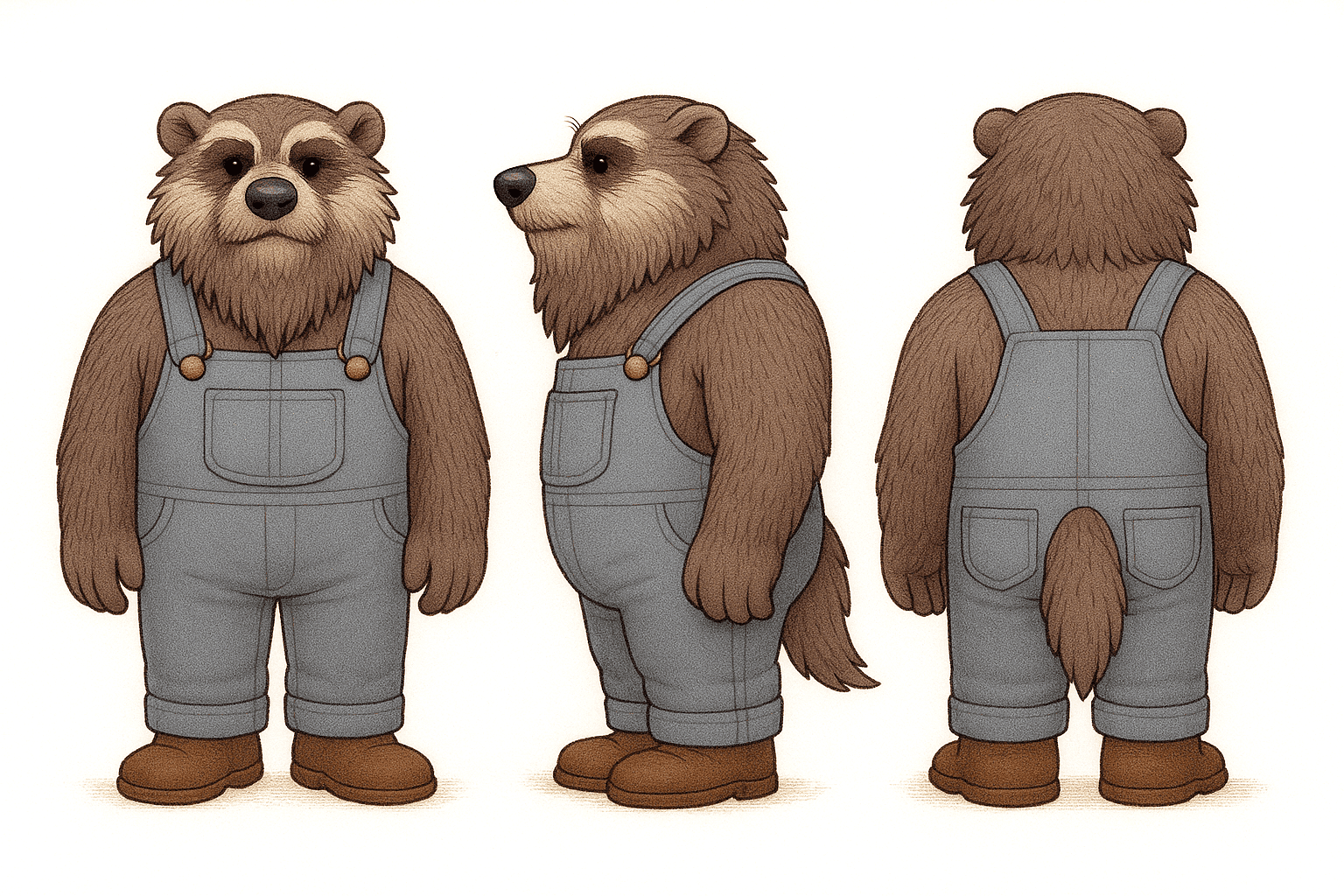 Marcel est un vieux blaireau chauffeur de bus scolaire, massif et voûté, toujours en salopette rapiécée et bottes poussiéreuses. Avec sa barbe en bataille, ses yeux noirs plissés et son air bourru, il pourrait sembler intimidant… mais derrière son apparence fatiguée se cache une présence discrète et protectrice.