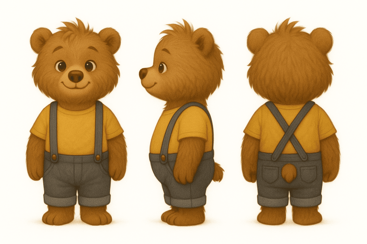 Oren est un ourson brun clair de 8 ans, petit et trapu, reconnaissable à son pelage épais un peu ébouriffé et à sa touffe rebelle sur la tête. Toujours vêtu de sa chemise à carreaux bleue et de sa casquette rouge, il se déplace avec une maladresse attendrissante qui cache une énergie inépuisable. Son grand sourire et ses yeux pétillants en font une présence joyeuse et rassurante.