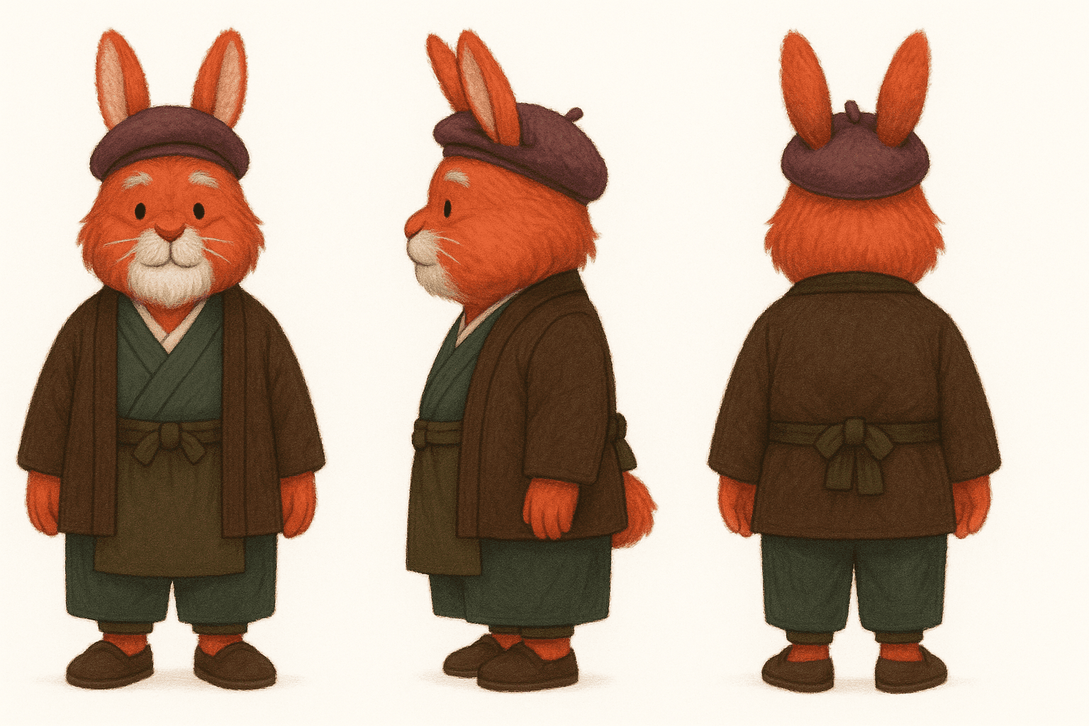 Grand-Père Pon est le lapin gâteau du village : dodu, souriant, toujours une friandise dans la poche et une recette à raconter. Ses grandes oreilles tombantes et sa moustache frétillante accompagnent son rire contagieux.