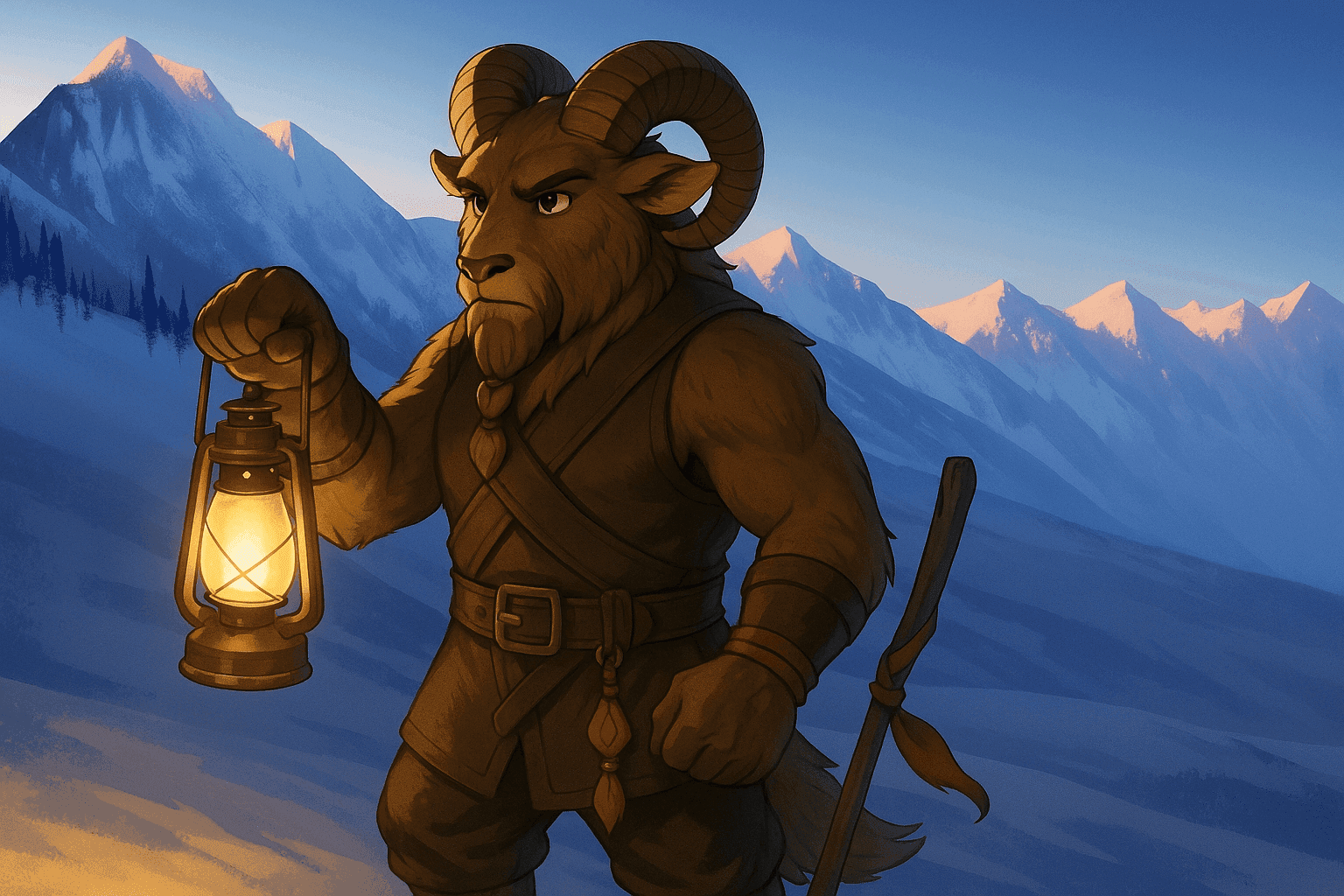Pelnar est le gardien des falaises et des grottes de Midmanchia. Avec son dos voûté par des décennies d’effort et ses cornes marquées de rubans saisonniers, il veille sur les voyageurs qui osent s’aventurer dans les passages escarpés. Sa silhouette trapue et sa barbe nattée font de lui une figure à la fois rassurante et redoutable.