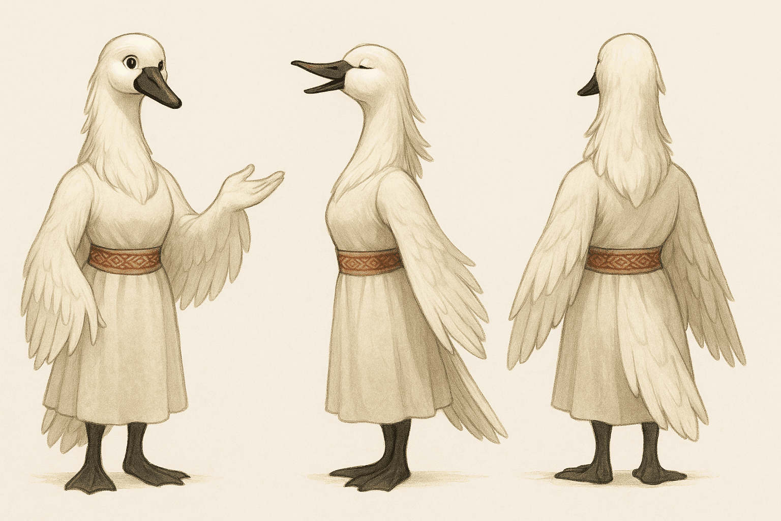 Sho est une cygne trompette des montagnes de 36 ans, grande et gracieuse, dont le port altier et les longues plumes souples fascinent tous ceux qui la regardent. Sur scène, son bec noir long et ses yeux gris pâle s’illuminent de passion, chaque geste et chaque note reflétant sa sensibilité artistique et son charisme naturel.