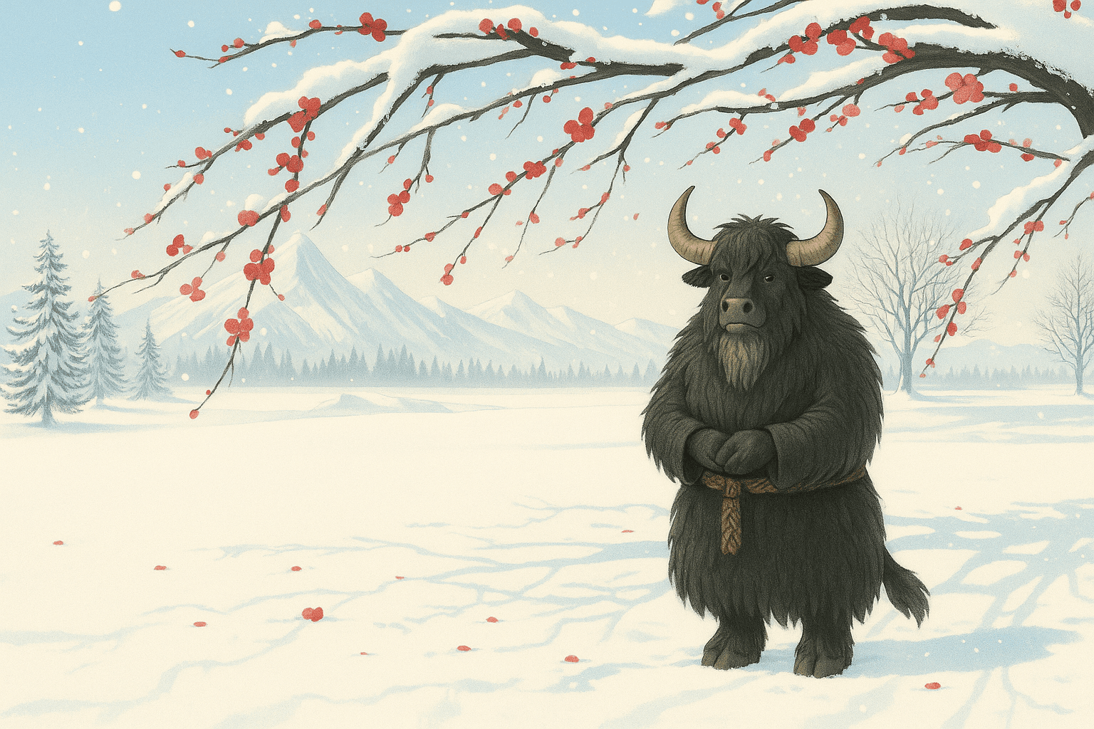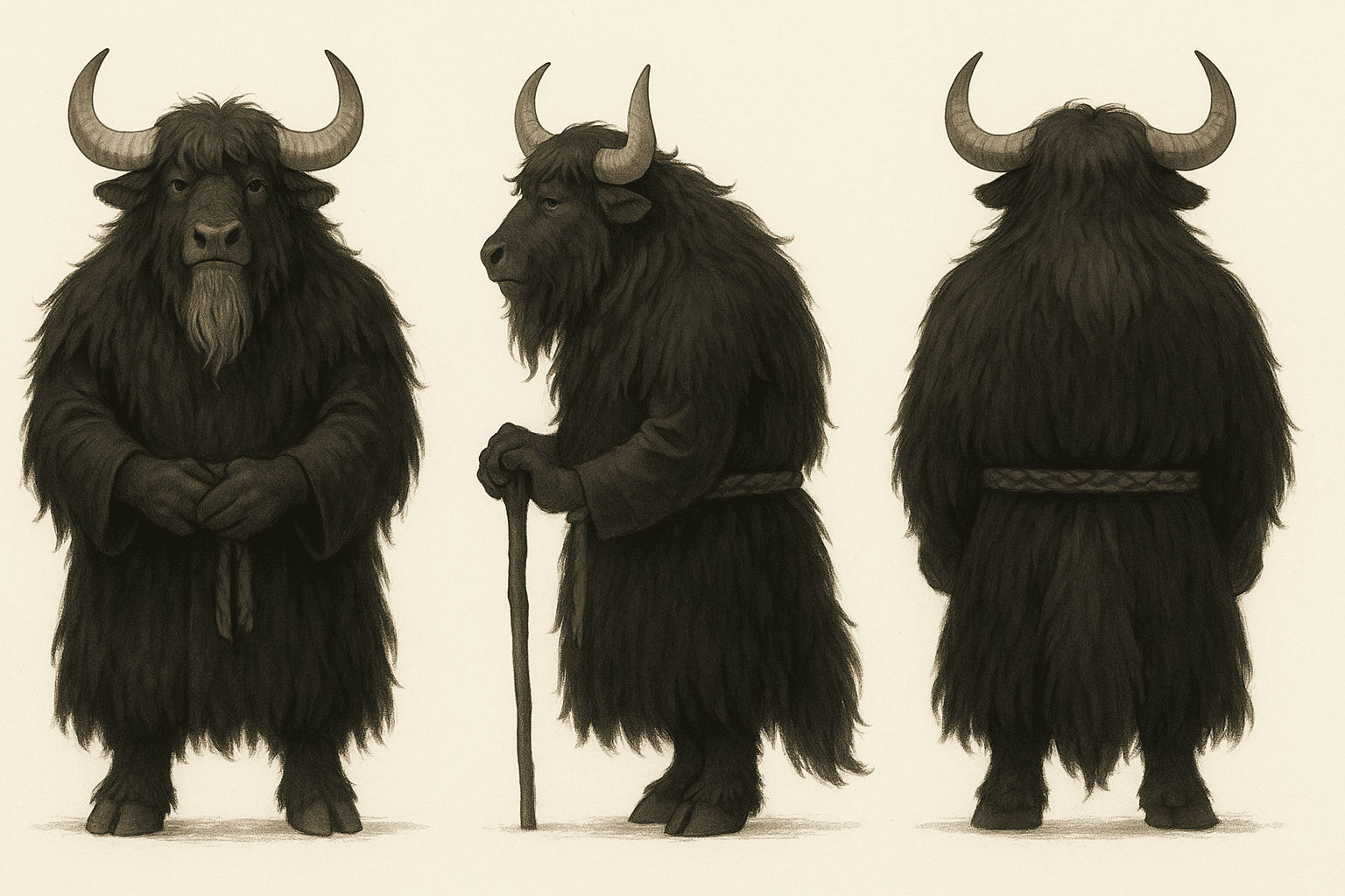 Sonam est un yak immense et massif de 60 ans, reconnu pour sa sagesse parmi les caravaniers. Son museau carré et ses yeux noirs profonds traduisent une compréhension silencieuse du monde, tandis que son long manteau laineux ajoute à son aura imposante mais chaleureuse. Maître d’école et éleveur de yaks, il guide les jeunes et les voyageurs avec patience et bienveillance, toujours à l’écoute de chacun.