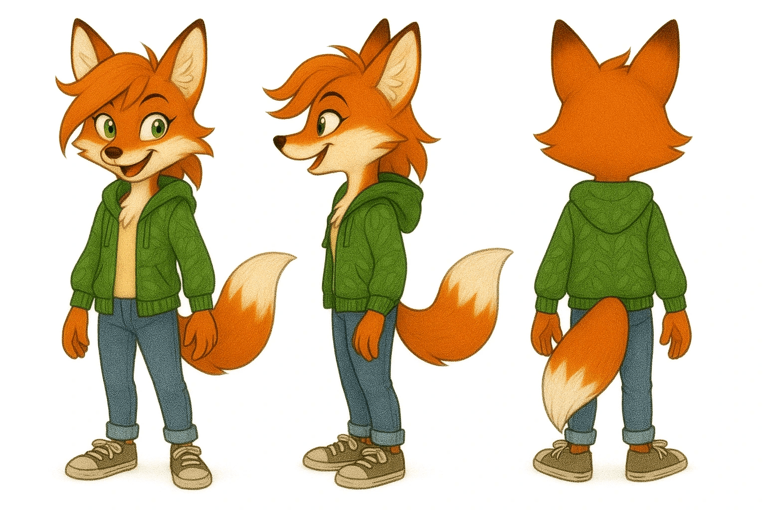 Velya est une jeune renarde de 9 ans au pelage roux éclatant et au regard vert vif qui ne tient jamais en place. Avec sa chemise hawaïenne bleue, son jean retroussé et ses baskets usées, elle affiche un style décontracté qui colle à sa personnalité effrontée. Sa mèche rousse rebelle et son sourire en coin suffisent à révéler son goût pour les plans improvisés et les bêtises organisées.